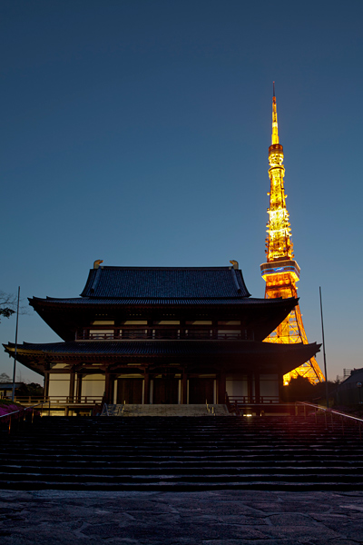 Au crépuscule, les néons de la Tokyo Tower se reflètent sur les toits du temple bouddhique Zōjō-ji.