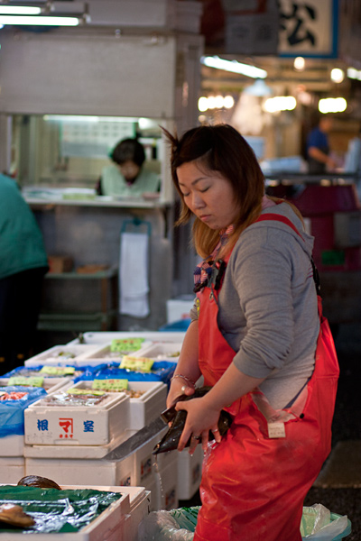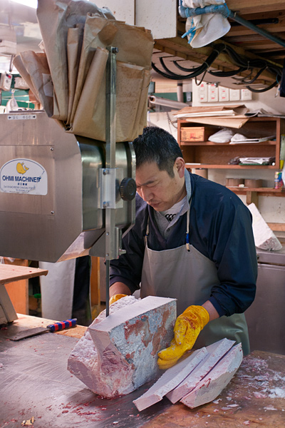 Les poissons tout juste achetés sont immédiatement découpés (parfois encore congelés) pour être revendus ensuite à des petits détaillants ou des restaurants.