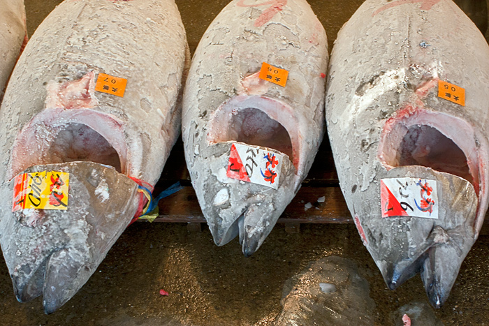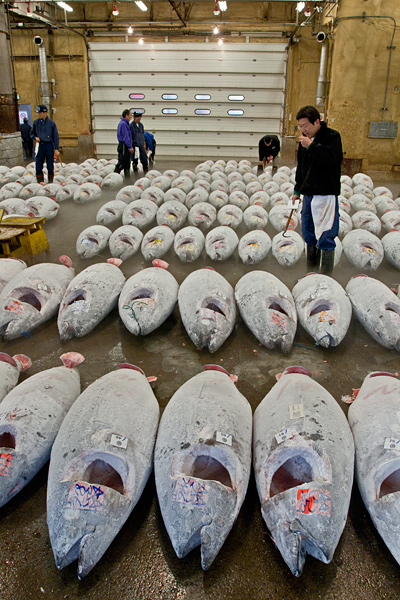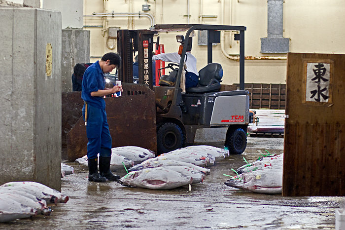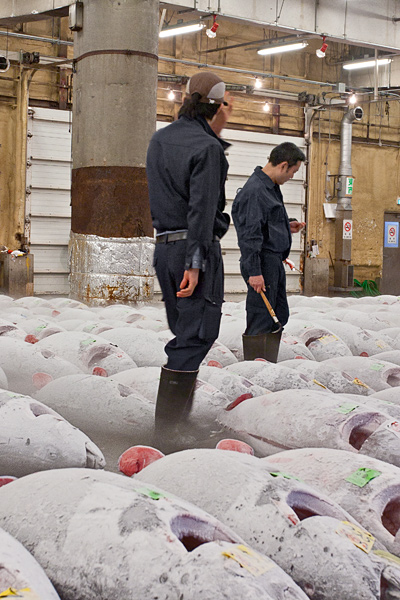 Il est 5 heures 30, nous arrivons. Nous tâchons de nous faire discrets, car ici c’est avant tout un lieu de travail des professionnels de la mer. Les bateaux arrivés plus tôt dans la matinée ont déjà été déchargés et c’est la vente aux enchères (criée) qui commence. Ici, la vedette c’est le thon. Les poissons sont numérotés et étalés sur le sol, puis les acheteurs évaluent minutieusement la qualité de chaque thon.
